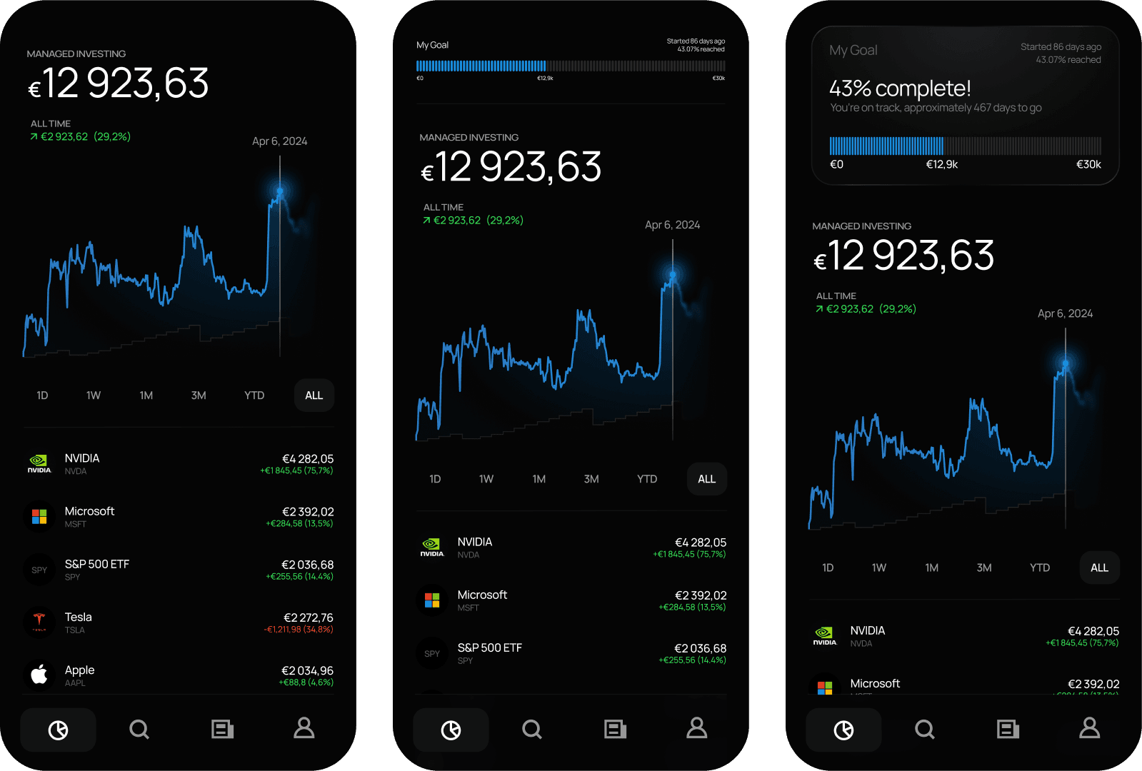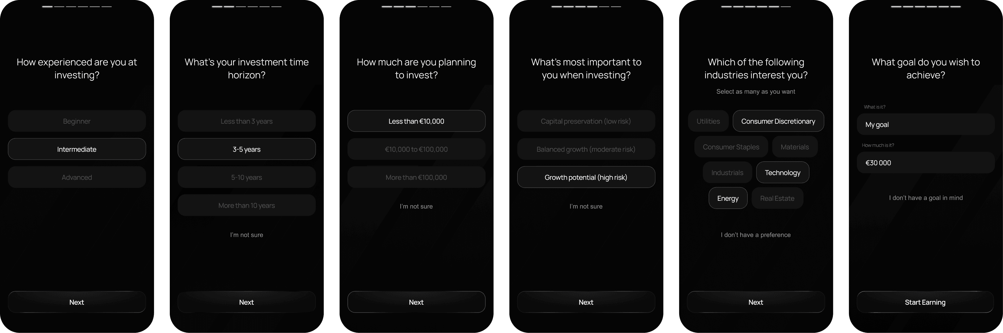 We designed an investment app that makes the complex parts invisible. The interface guides users through stock recommendations based on their risk tolerance and investment goals, starting with a simple onboarding flow that doesn't feel like paperwork.