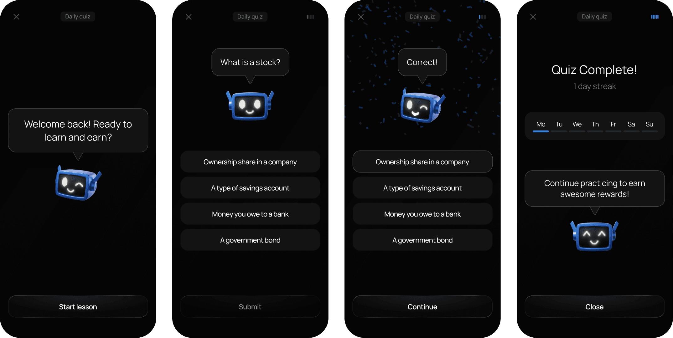 The app includes a live AI assistant for investment questions, gamification that makes financial literacy engaging through daily quizzes and streaks, and a clean interface for exploring courses and market data. The principle was simple: investing shouldn't require a finance degree.