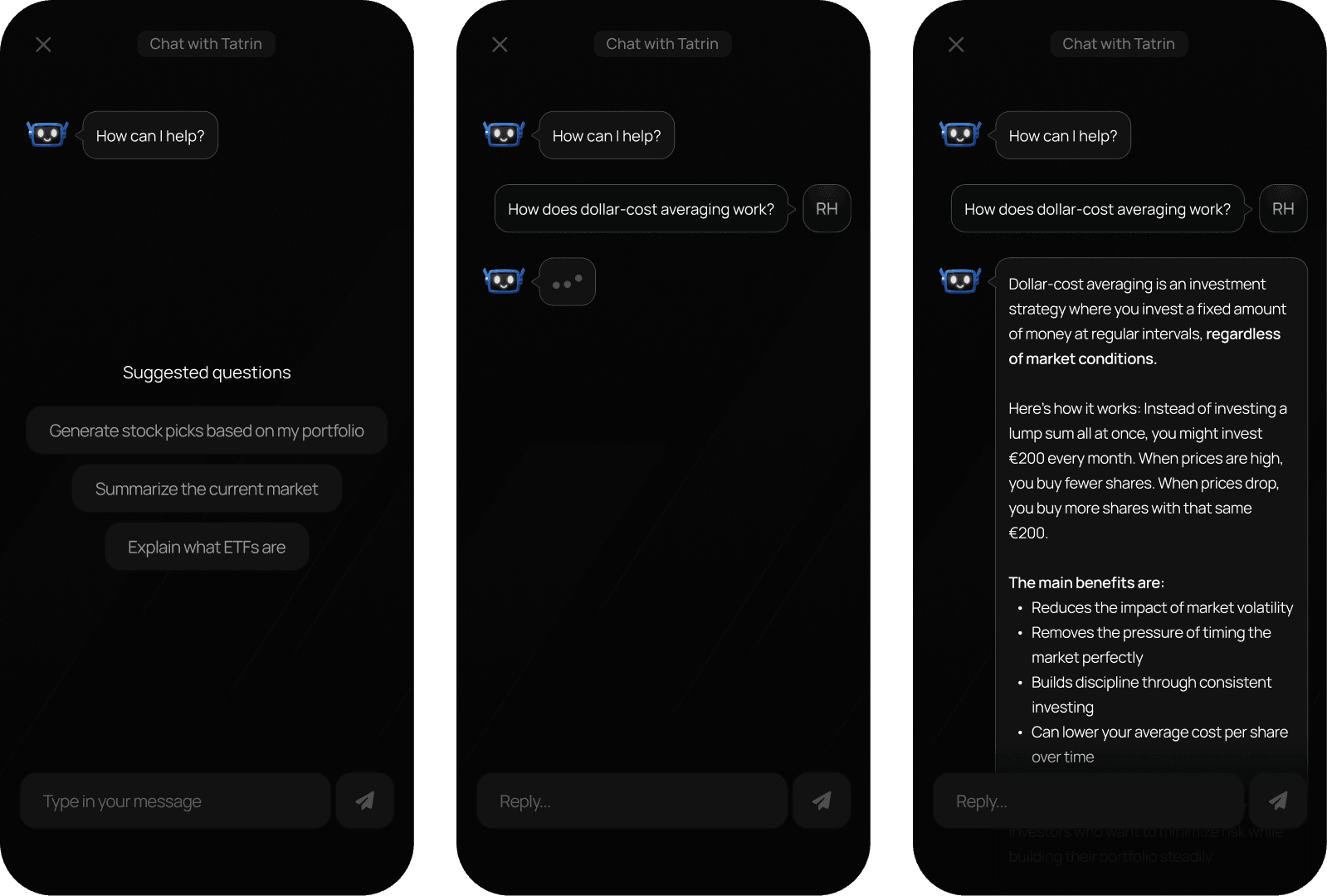 The interface stays consistent with Tatra Banka's brand while introducing modern patterns that work for younger users. Every screen focuses on clarity and ease of use. Daily financial quizzes build learning streaks without feeling like homework. The AI chat uses conversational patterns that break down complex concepts in plain language.